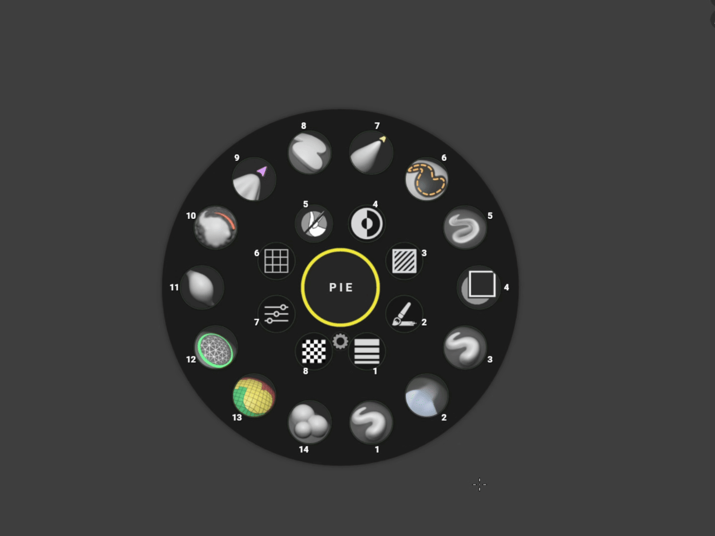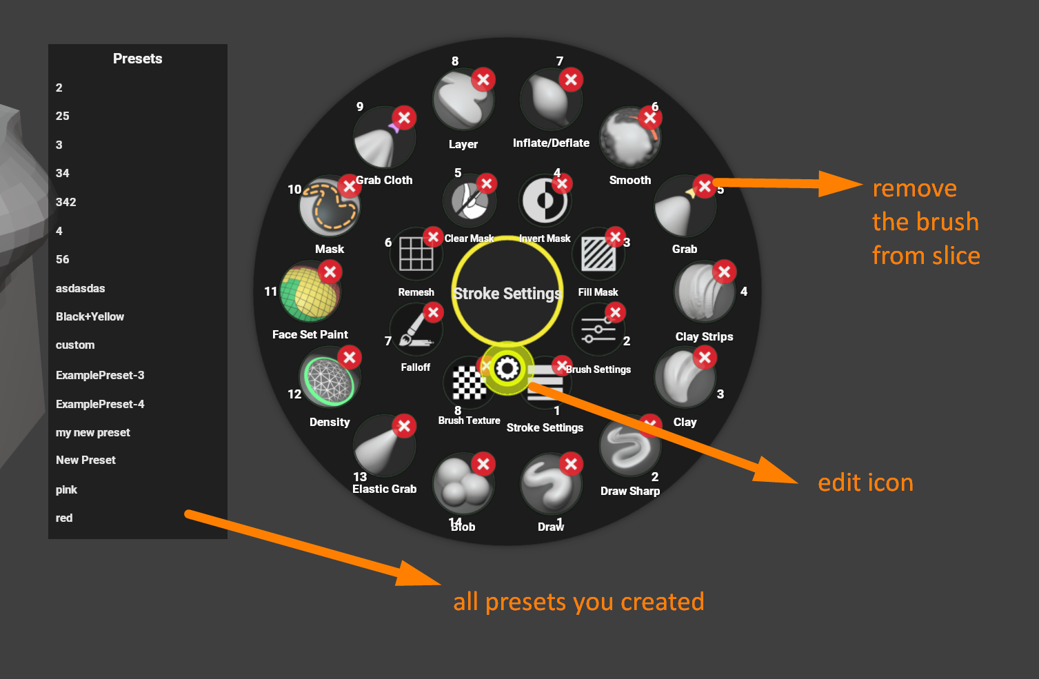 Easily rearrange, add, or remove any brush or tool directly on the pie menu using Edit Mode.